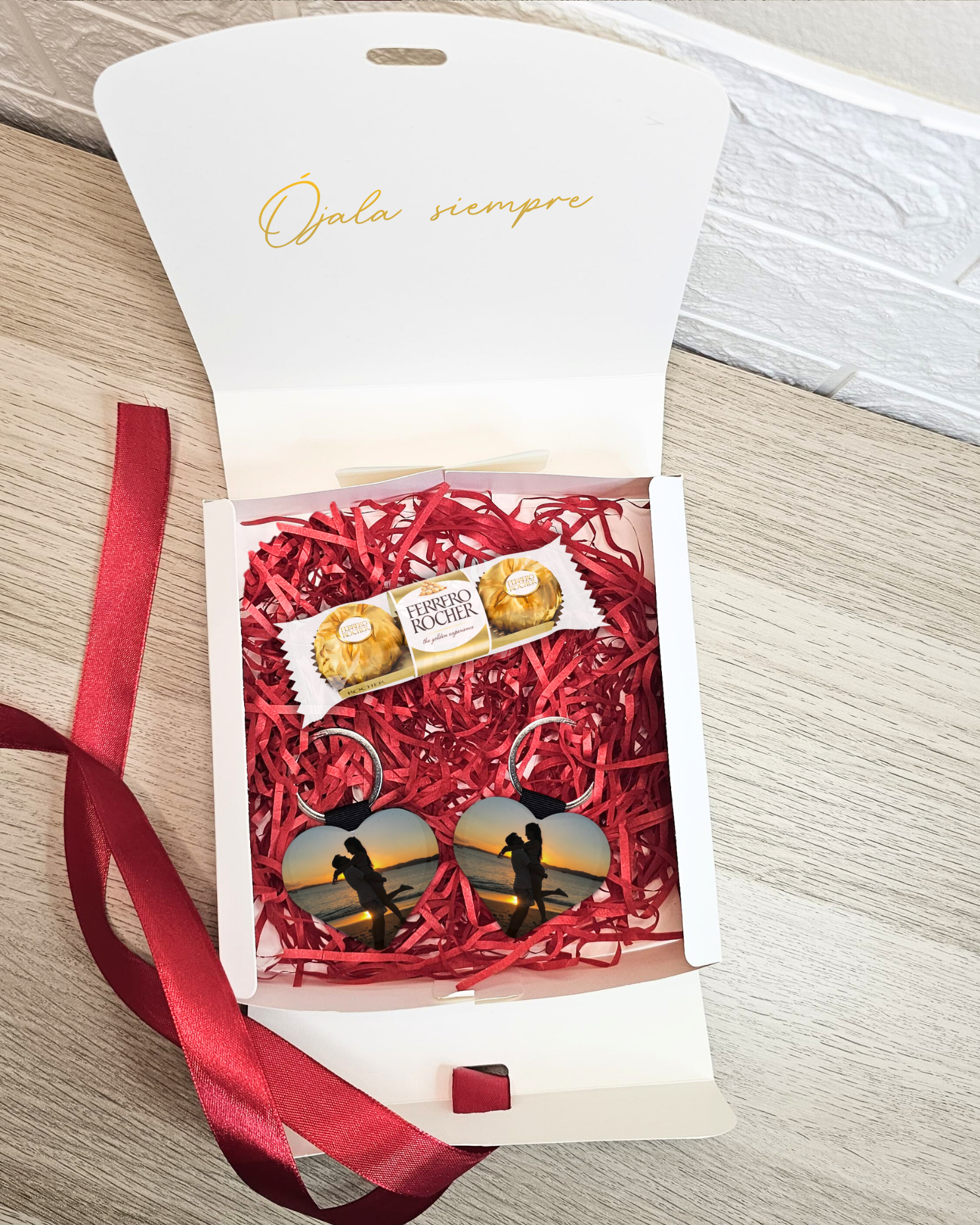 Un regalo pequeño en tamaño, pero enorme en significado. Esta caja especial de San Valentín incluye dos llaveros de polipiel personalizados por ambas caras y un toque dulce para conquistar corazones.