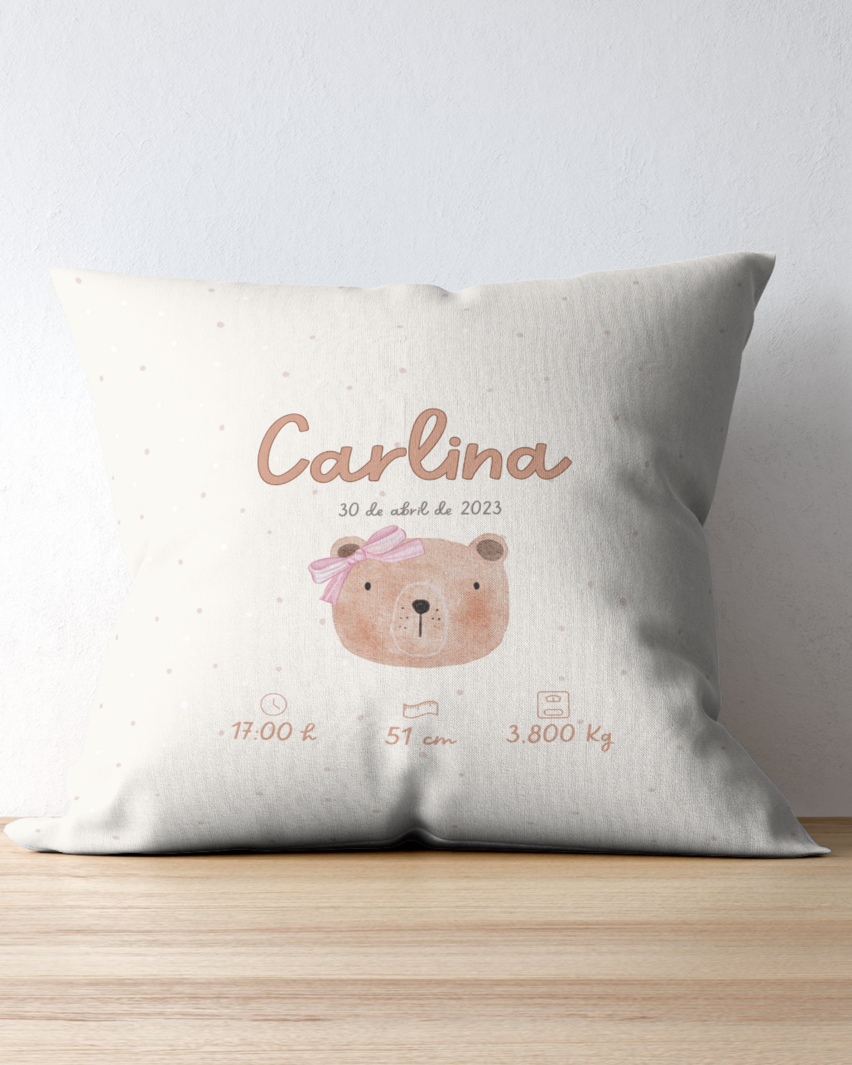 Dale un toque especial a la habitación de tu bebé con este cojín de diseño dulce, protagonizado por un adorable osito. Personalizado con su nombre y todos sus datos de nacimiento, se convierte en un recuerdo único que podrás conservar para siempre.