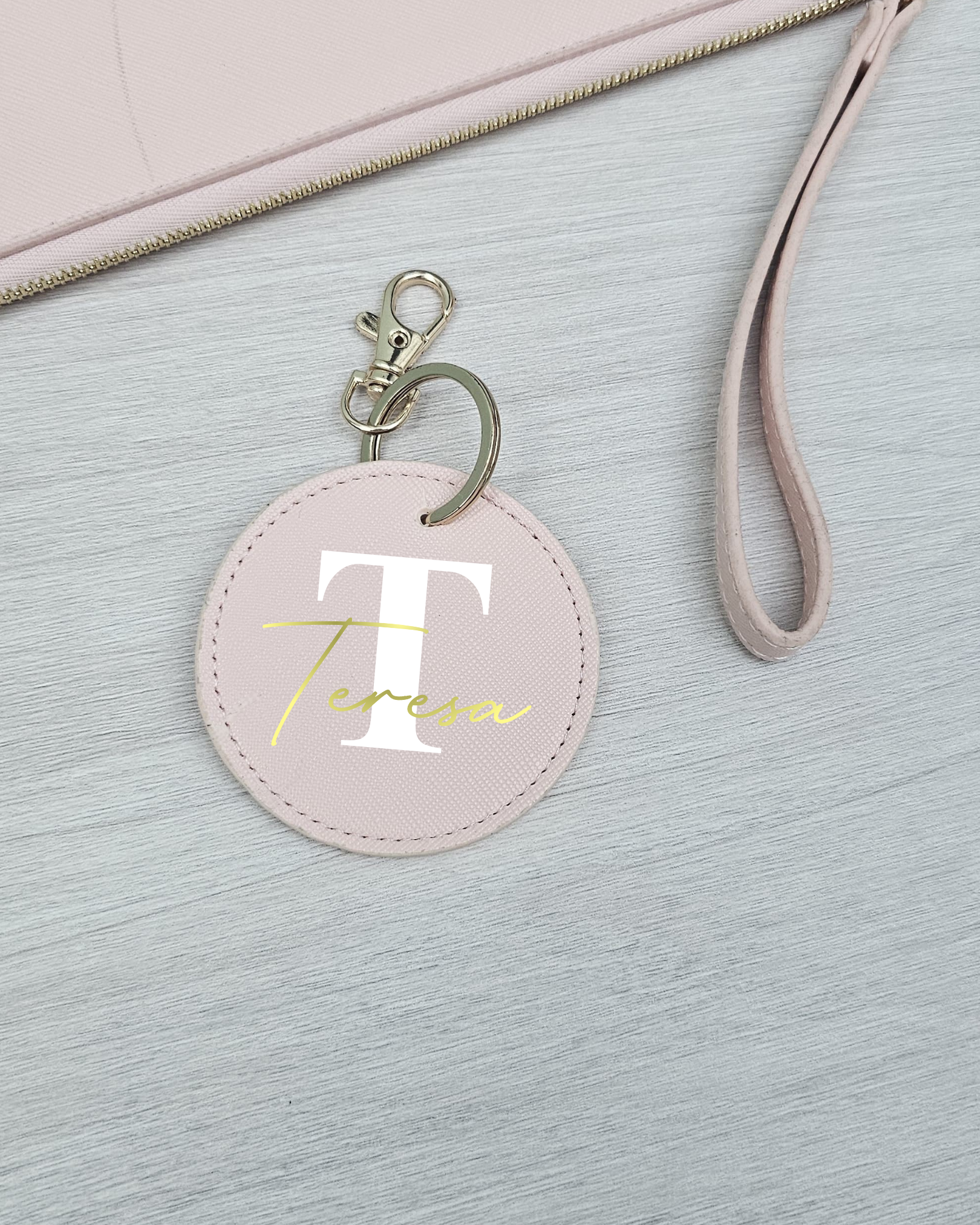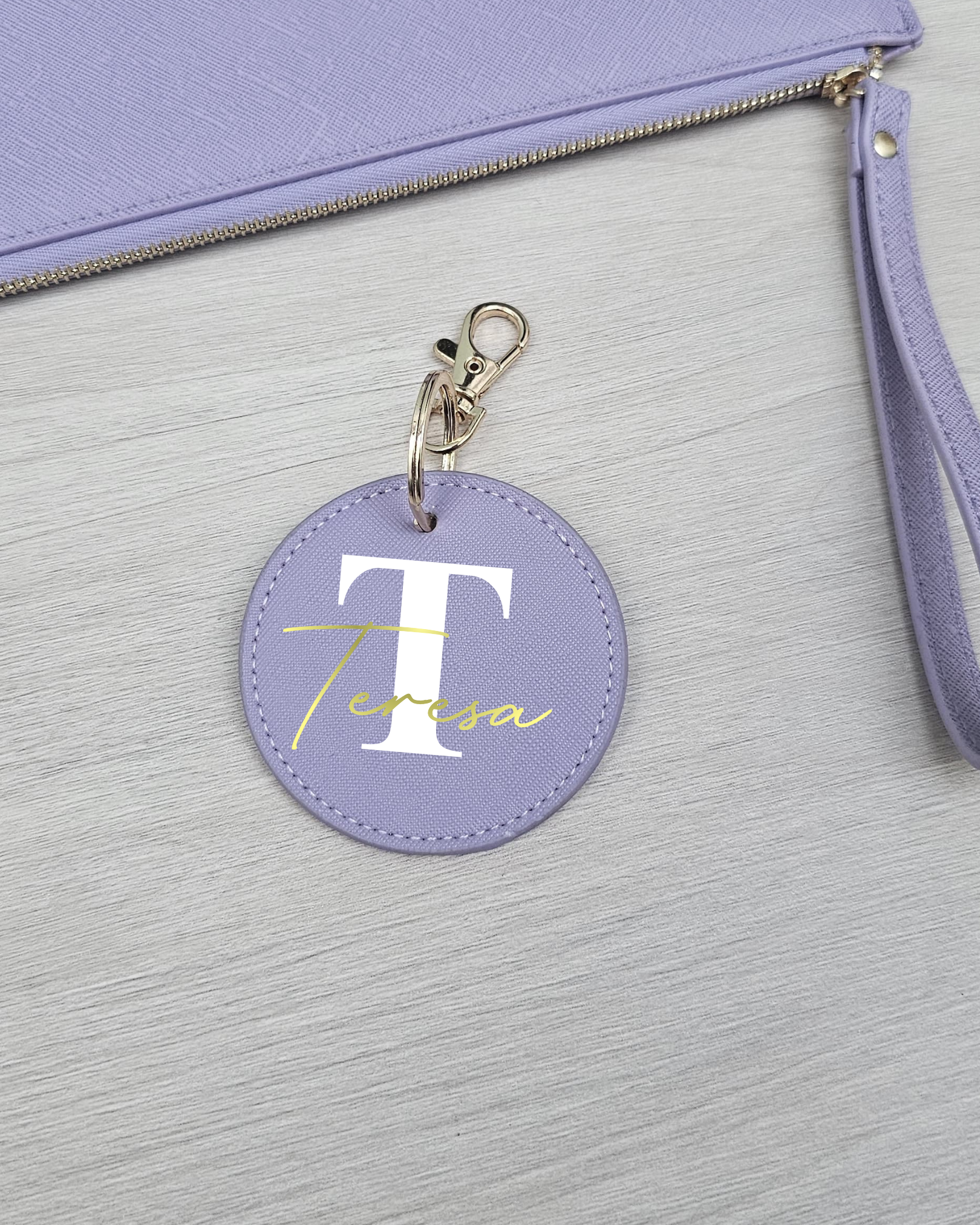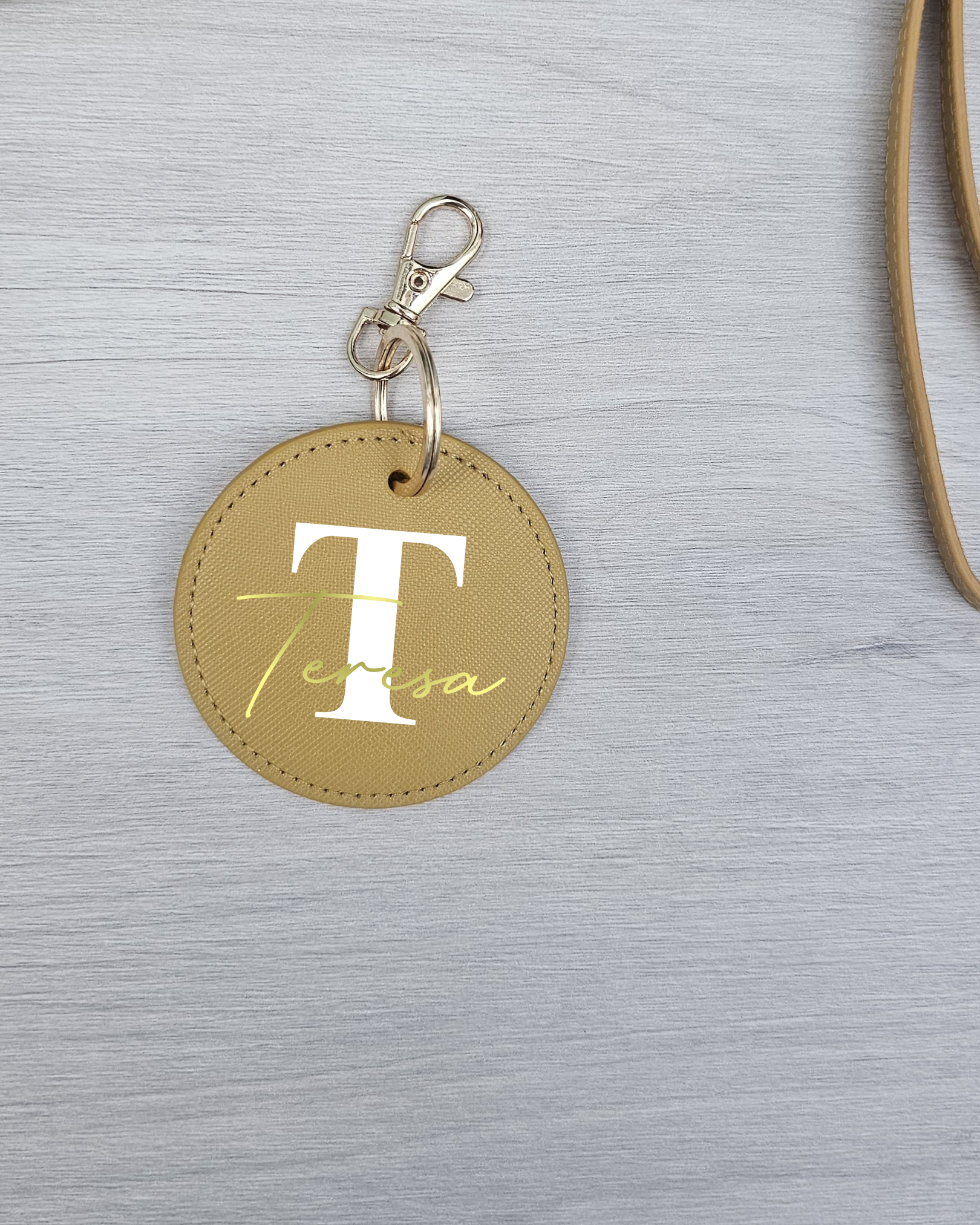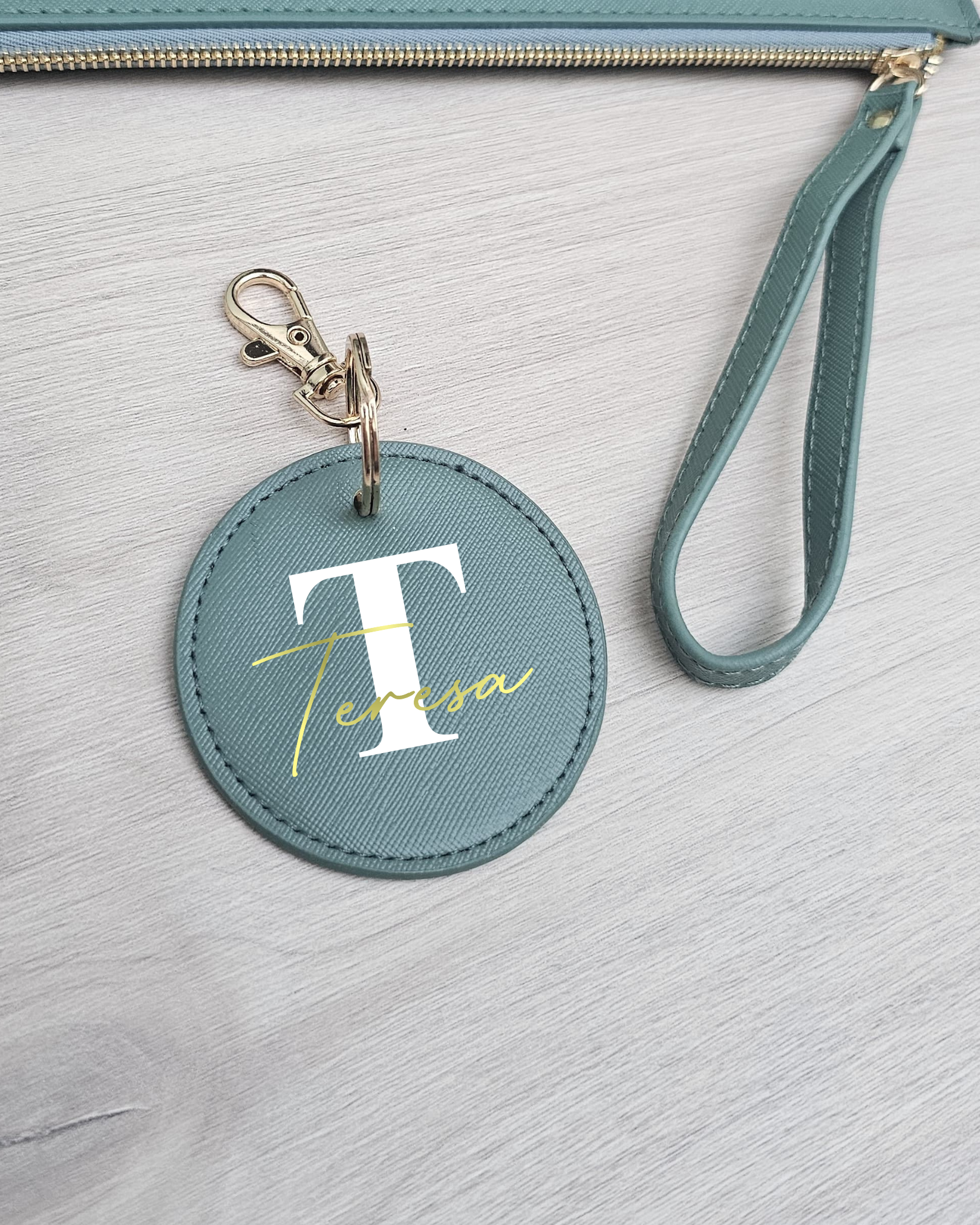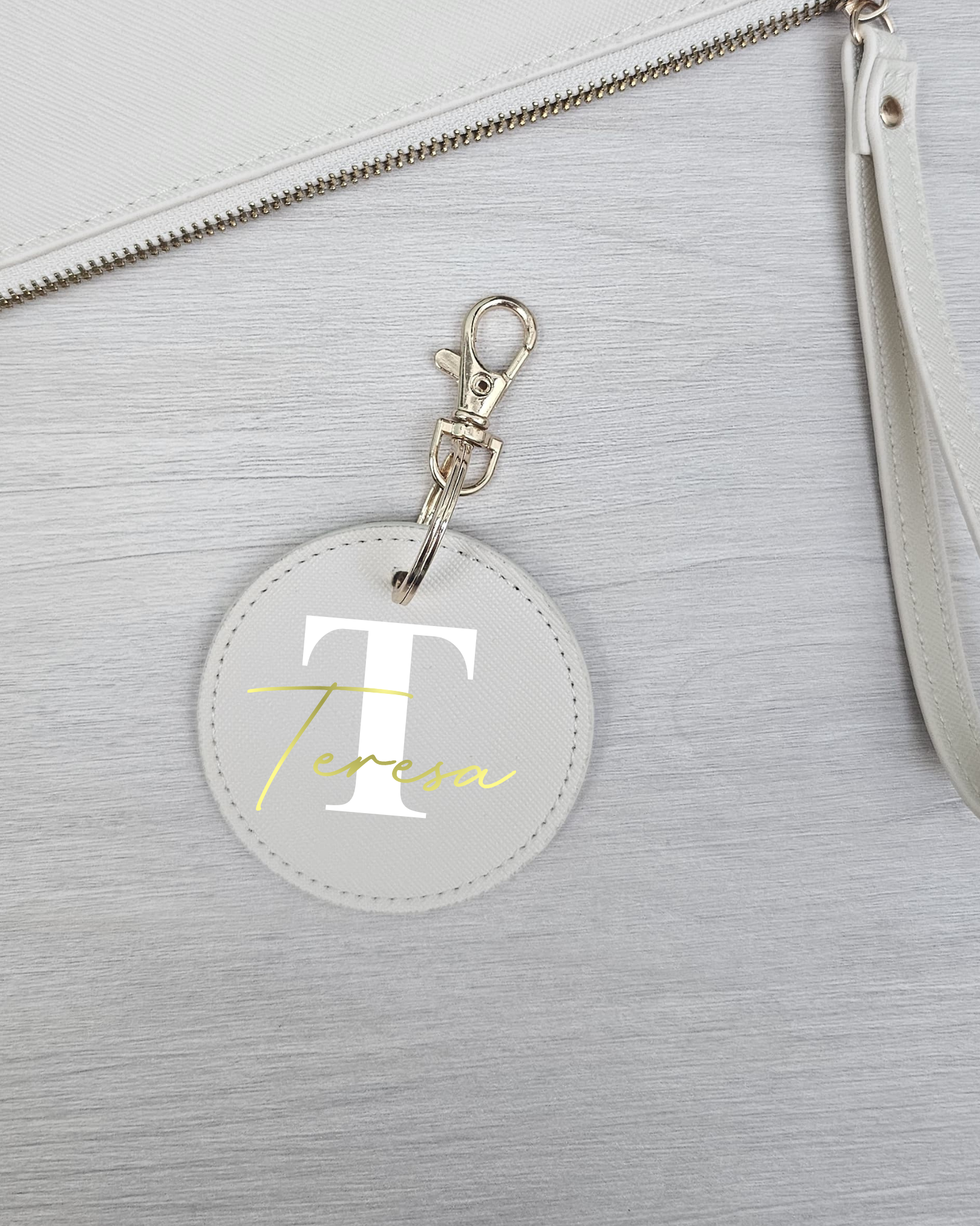 Llavero de polipiel saffiano con un diseño elegante y moderno (disponible en varios colores) personalizado con inicial y nombre. Para llevar tus llaves con estilo o colgarlo en el bolso, mochila o donde más te guste.
